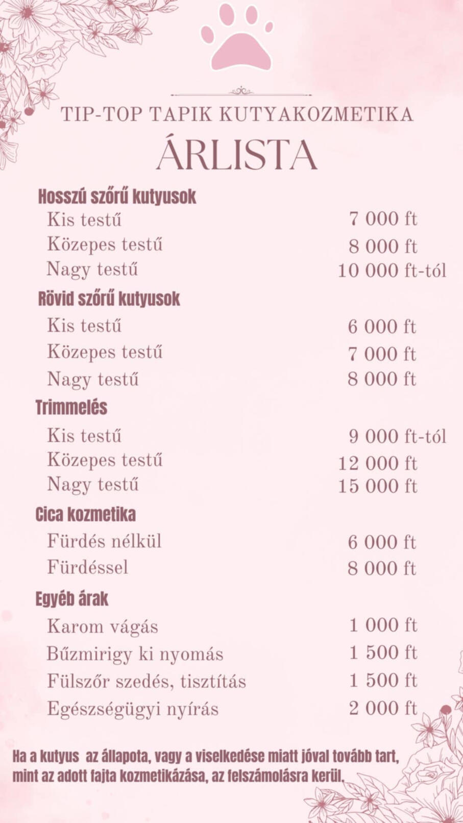 Üdvözöljük a Tip-Top Tapik Kutyakozmetikában!Nálunk minden kutya királyi bánásmódban részesül, ahol gondoskodunk bundás barátja szépségéről és komfortjáról. Szolgáltatásaink közé tartozik a fürdetéstől a nyírásig minden, hogy kutyusa ne csak tiszta, de boldog is legyen.Kedvence egészsége és elégedettsége mindig elsődleges számunkra. Nyugodt és barátságos környezetben dolgozunk, hogy a kozmetikai élmény stresszmentes legyen mindenki számára. Bízza ránk kedvencét, és garantáljuk, hogy mosolyogva hagyják majd el a szalont.Várjuk Önt és a kutyusát a Tip-Top Tapik Kutyakozmetikában, ahol a szépség és a gondoskodás magától értetődő.Köszönjük, hogy minket választott!